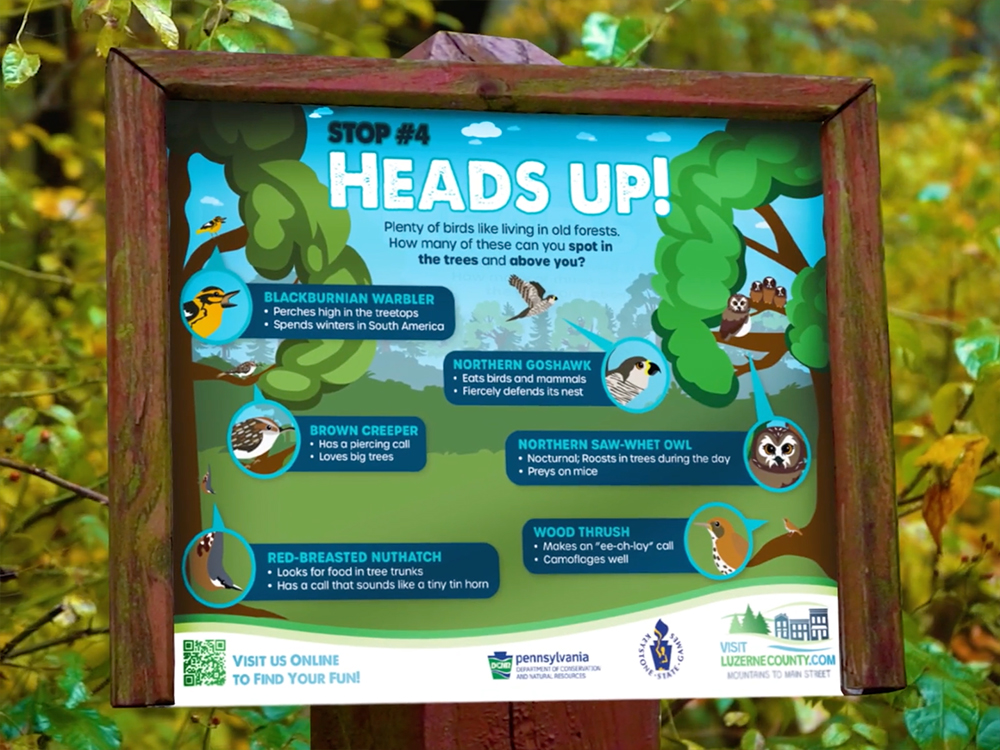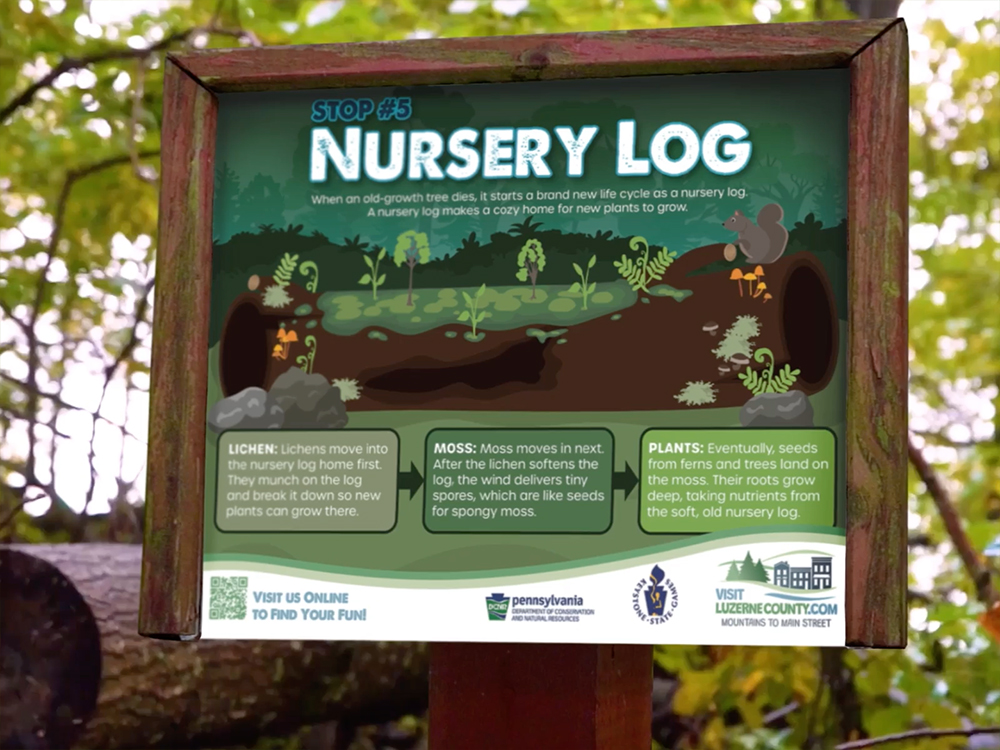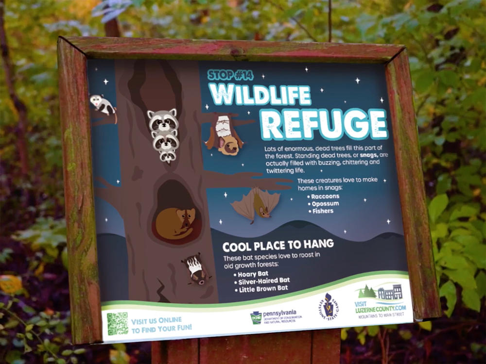 In 2021, Visit Luzerne County asked Coal Creative to create new signs for the kids’ trail at Ricketts Glen State Park. Each sign features eye-catching illustrations paired with facts about what kids may encounter on the trail.