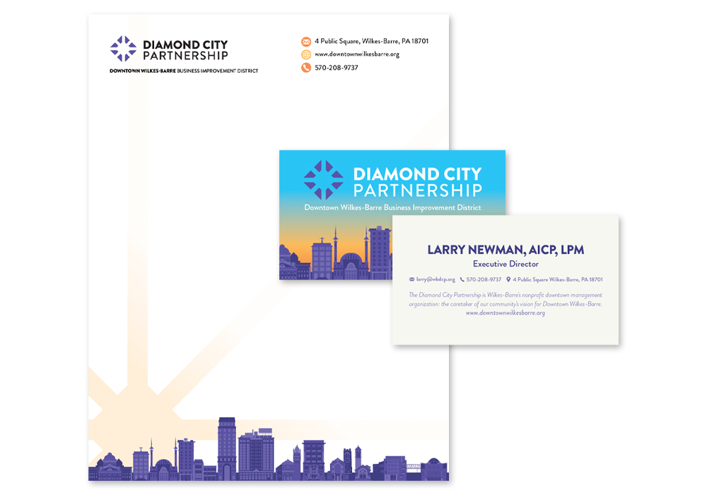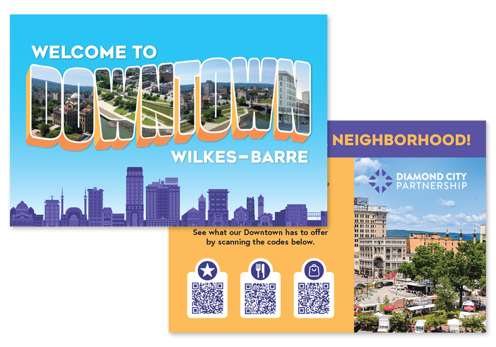 Diamond City Partnership works to make Downtown Wilkes-Barre, PA (Coal Creative’s home base), a better place to live, work, and hang out in. When they reached out to us, we were thrilled to get the opportunity to collaborate with them! Our team illustrated a custom skyline for a few of their print materials, featuring iconic Wilkes-Barre buildings. We used that to create the base of their look and feel, which we carried into other designs, like business cards, a postcard that was sent out to college students, and a flyer that was distributed to local businesses.