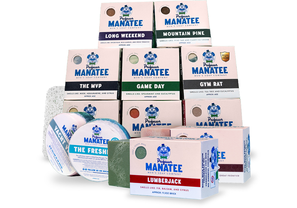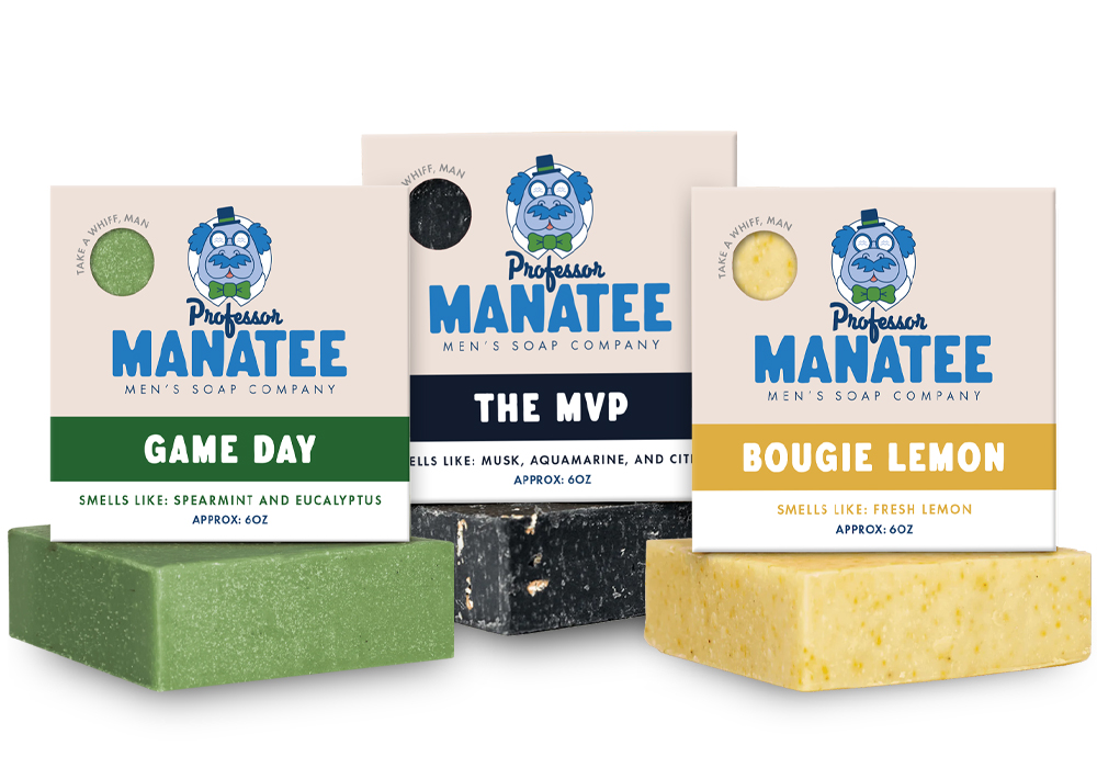 Coal Creative collaborated with Professor Manatee Soap Company on their packaging from start to finish. After developing the brand colors, fonts, and logos, we worked with the team to brainstorm soap names and descriptions. We created different packaging designs for each of the soap types they offer: 6oz bars, big brick bars, and luffa bars