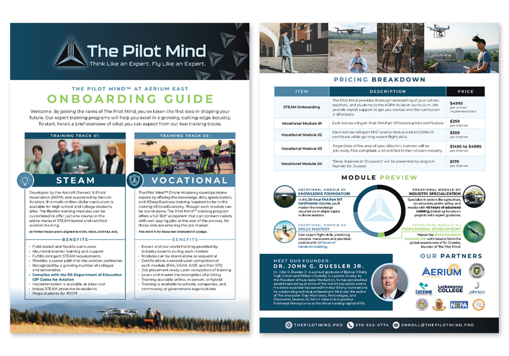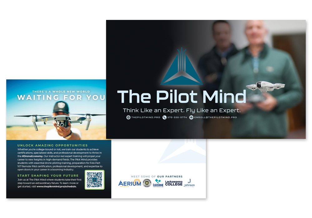 Pilot Mind Drone Academy is on track to become the drone capital of Pennsylvania. In 2024, its founder, Dr. John Duesler, approached us, looking for help creating various branding materials. Over the next few months, we created onboarding and training guides, a hover table training tool, letterhead and envelopes, a direct mailer, building signs, and swag items, including notepads and rulers.